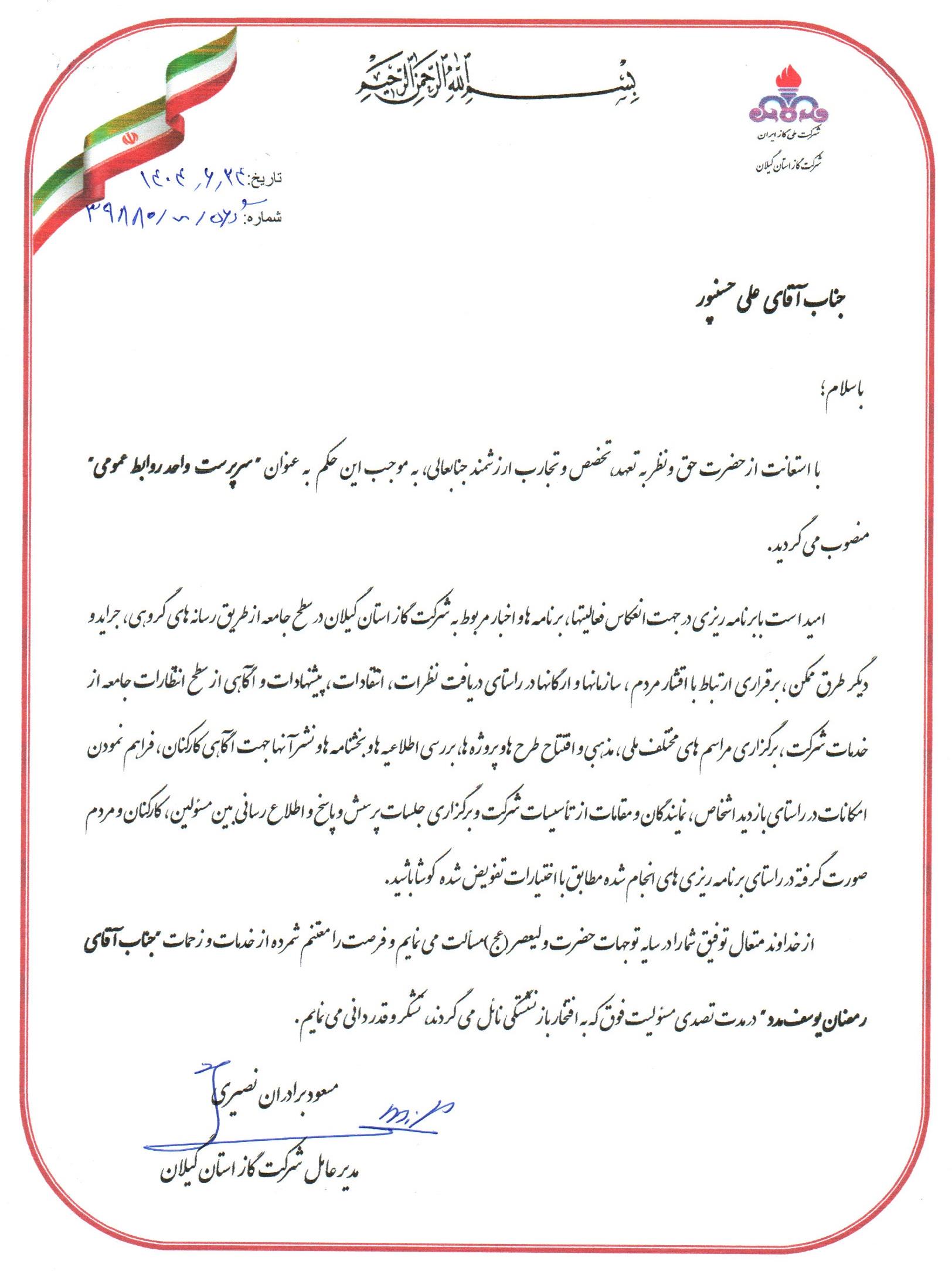 با استعانت از حضرت حق و نظر به تعهد، تخصص و تجارب ارزنده جنابعالی، به موجب این حکم، بعنوان «سرپرست واحد روابط عمومی» منصوب میگردید.