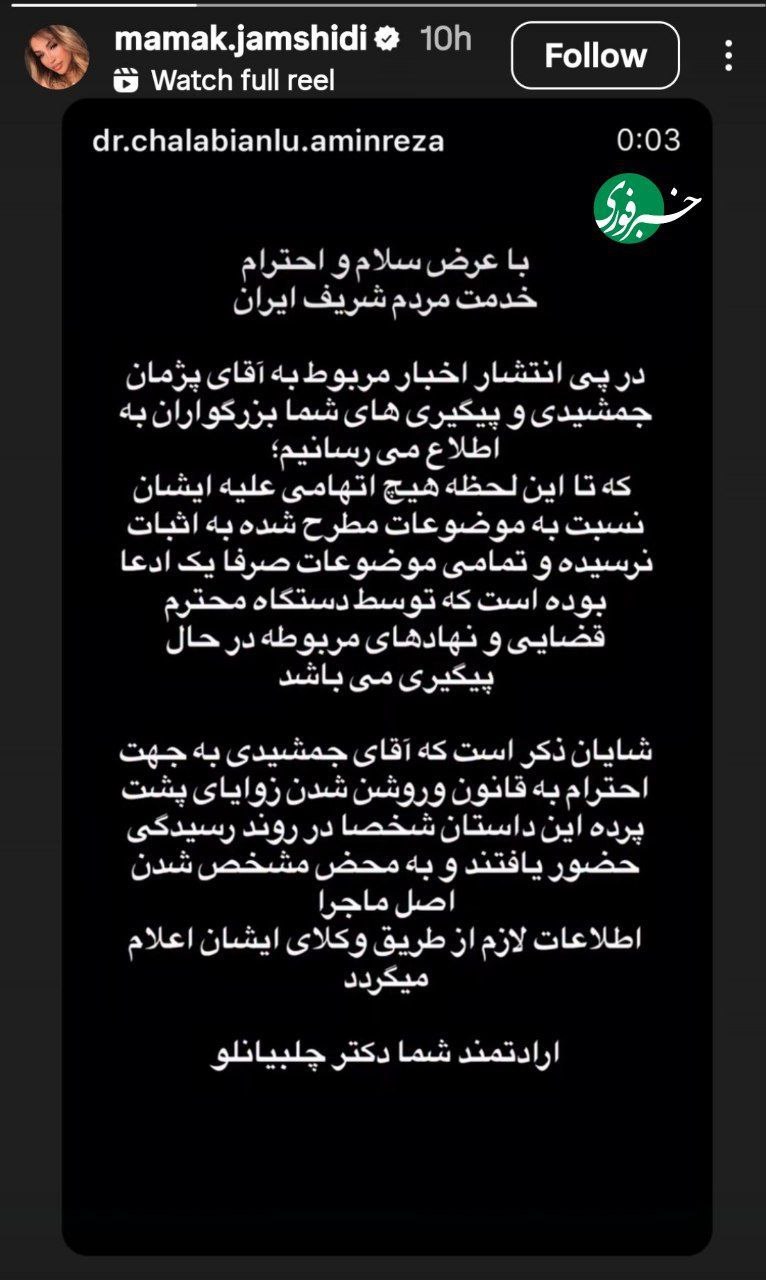 شایان ذکر است که آقای جمشیدی به جهت احترام به قانون وروشن شدن زوایای پشت پرده این داستان شخصا در روند رسیدگی حضور یافتند و به محض مشخص شدن اصل ماجرا اطلاعات لازم از طریق وکلای ایشان اعلام میگردد.